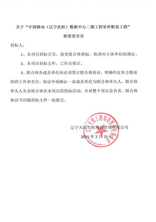 關(guān)于“中國(guó)移動(dòng)(遼寧沈陽)數(shù)據(jù)中心二期工程室外配套工程”的變更公告
