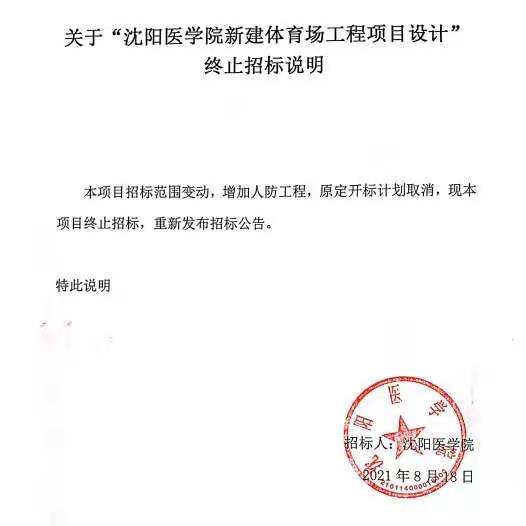 關(guān)于“沈陽(yáng)醫(yī)學(xué)院新建體育場(chǎng)工程項(xiàng)目設(shè)計(jì)”終止招標(biāo)說(shuō)明